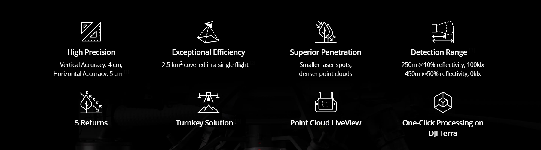 Smaller Laser Spots, Denser Point CloudsWith a reduced spot size of 4×12 cm @100m, only a fifth of that of L1, L2 not only detects smaller objects with more details, but can also penetrate denser vegetation, generating more accurate digital elevation models (DEM). |