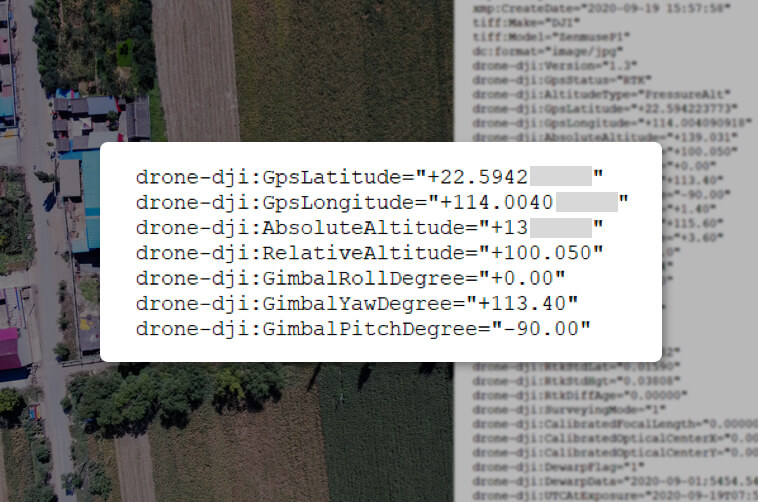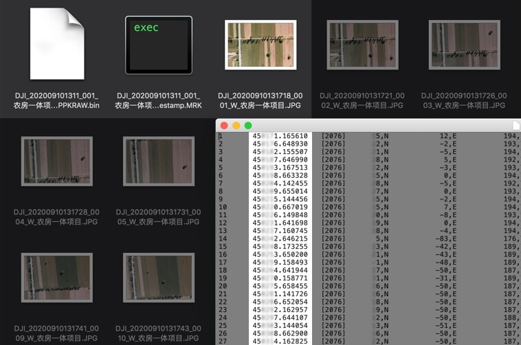 | Mission result files are automatically associated with the Mission Name and Mission Time. | A centralized storage location for photos, GNSS data, and TimeStamps.MRK files. | The image metadata contains the camera’s intrinsic and extrinsic parameters and the status of RTK. |