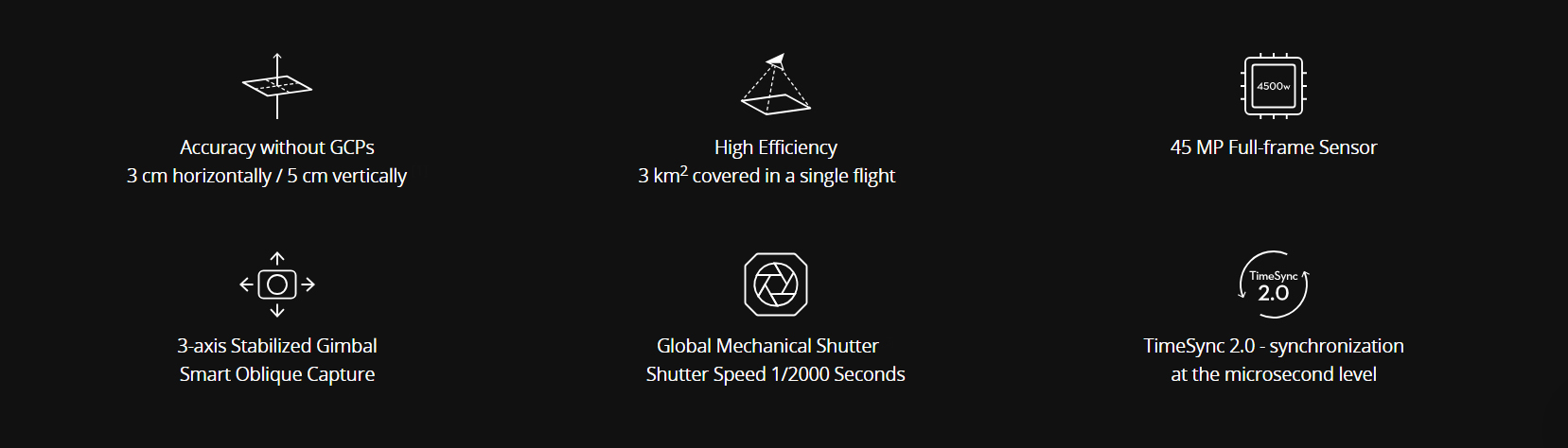 Extraordinary EfficiencyThe P1 includes a full-frame, low-noise high-sensitivity sensor that can take a photo every 0.7 s during the flight, and covering 3 km2 in a single flight.