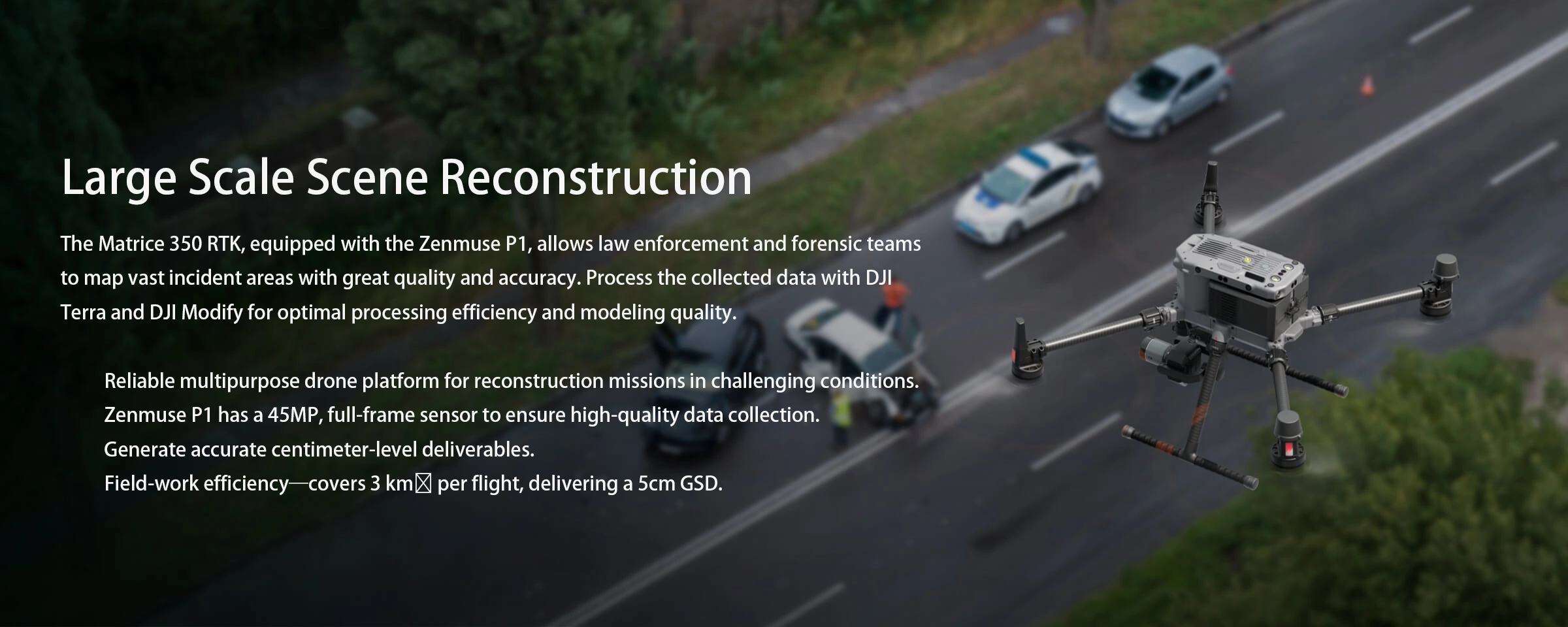 Clear roads faster with efficient and accurate drone-based data collection and reconstruction. Ensure personnel safety and digitize your forensics process.
